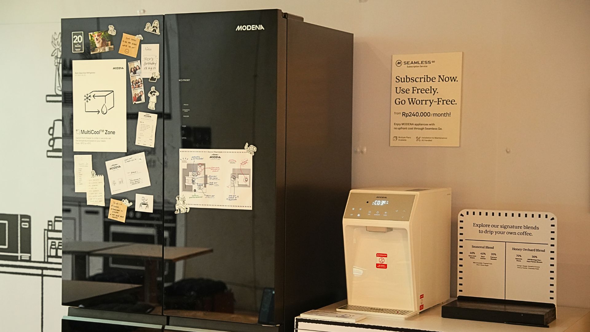 - Refrigerator Modena dengan desain sleek ditempatkan sebagai centerpiece yang tidak hanya berfungsi untuk menjaga kesegaran, tetapi juga menjadi tempat yang cocok bagi pengunjung untuk memamerkan foto-foto momen merekahangout mereka di Casa Modena.