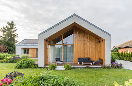 Atap pelana menjadi ciri khas utama rumah dengan desain Scandinavian. Atap ini terdiri dari dua bidang miring yang bertemu pada satu garis puncak, menghasilkan bentuk yang jelas dan fungsional. Di wilayah Nordik, atap pelana memiliki peran penting dalam mencegah penumpukan salju dan memastikan keamanan serta kelengapan rumah.